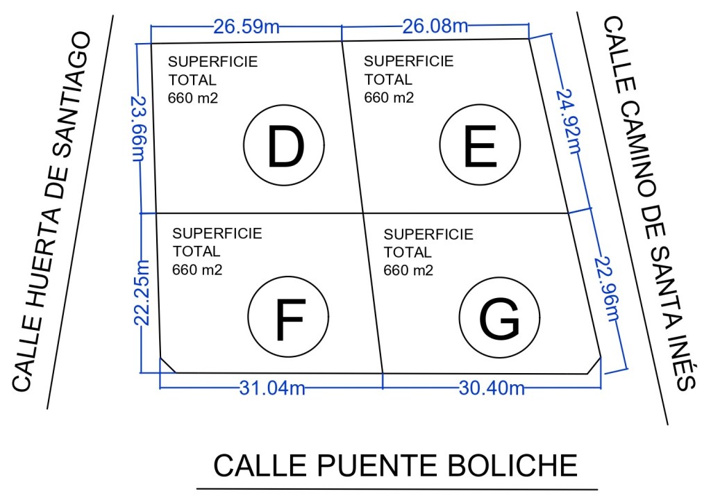PARCELA D, E, F y G: 660 m2 Aprox. c/u – PRECIO: 240€/m2 + IVA (en notaria pagaras únicamente el 1,5% de impuesto en lugar del 9% habitual)